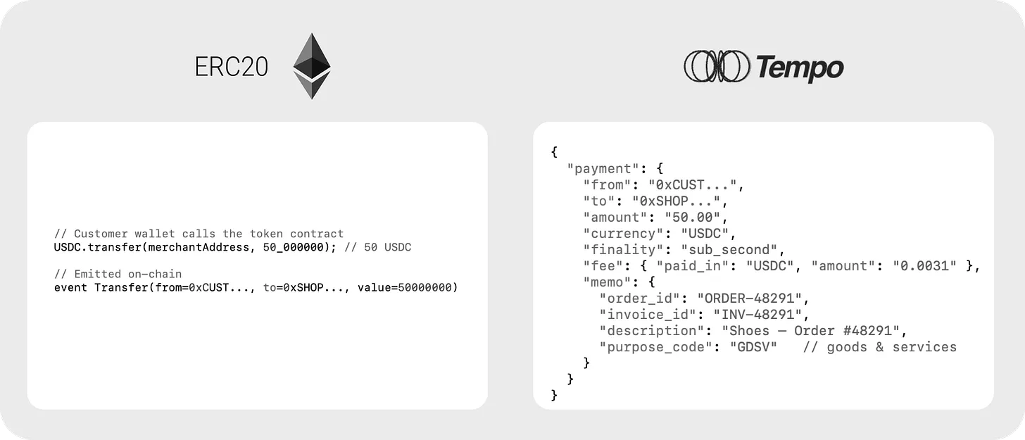 Unlike standard ERC-20 transfers, which only show the transfer address and amount, Tempo allows structured details to be attached directly to the payment. These details can include items like order IDs, invoice references, or short descriptive notes, mirroring the globally adopted ISO 20022 format used by banks.