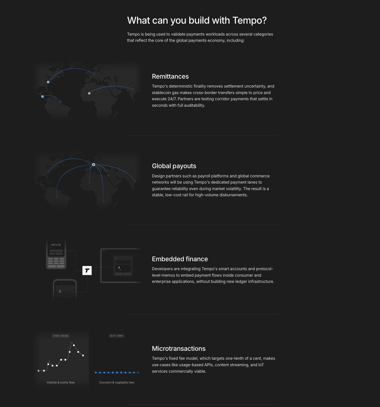 Payments have very different requirements. They need to be fast, cheap, reliable, and easy to integrate into existing systems. Tempo exists because we believe stablecoins deserve infrastructure that is built for those needs from the ground up.